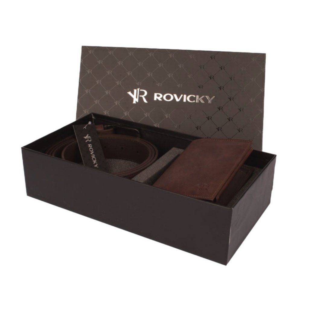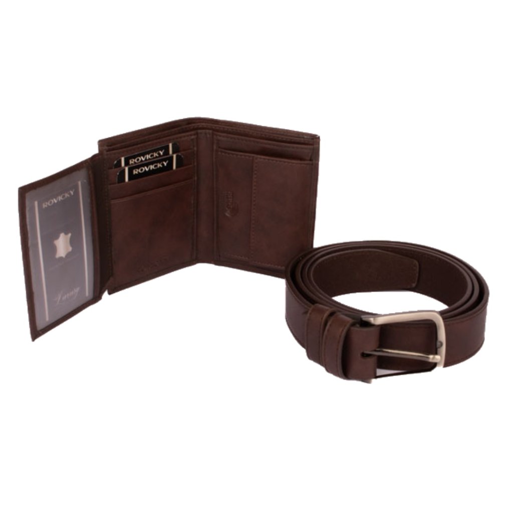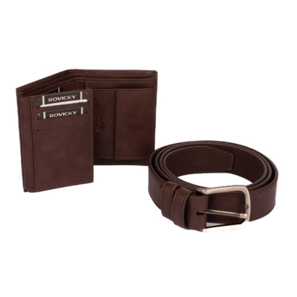 Dárková sada pánská obsahuje peněženku a kvalitní pásek. Sada je dodávána v dárkové kazetě. Pánská peněženka má uvnitř klasické uspořádání. Peněženka má mincovník uzavíratelný pevným drukem. Najdete zde dostatek kapes na platební karty. Pásek i peněženka jsou tmavě hnědé barvy a jsou vyrobené z umělé kůže.