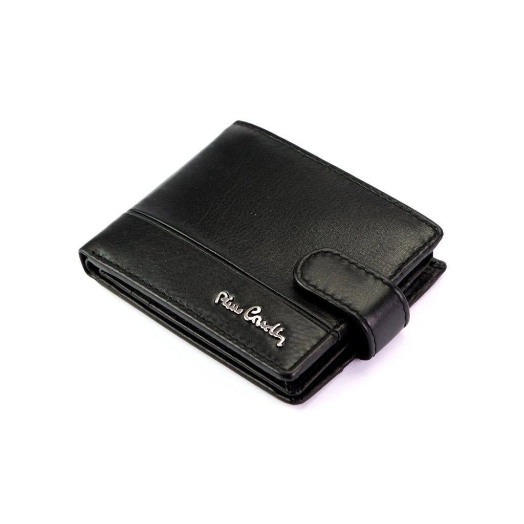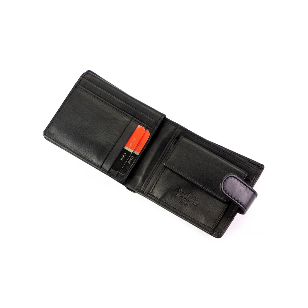 Pánská peněženka moderního vzhledu z pravé velmi jemné kůže v barvě černé. Peněženka se zapíná přezkou na cvoček. Peněženka je vyrobena z pravé kůže a je značky Pierre Cardin.