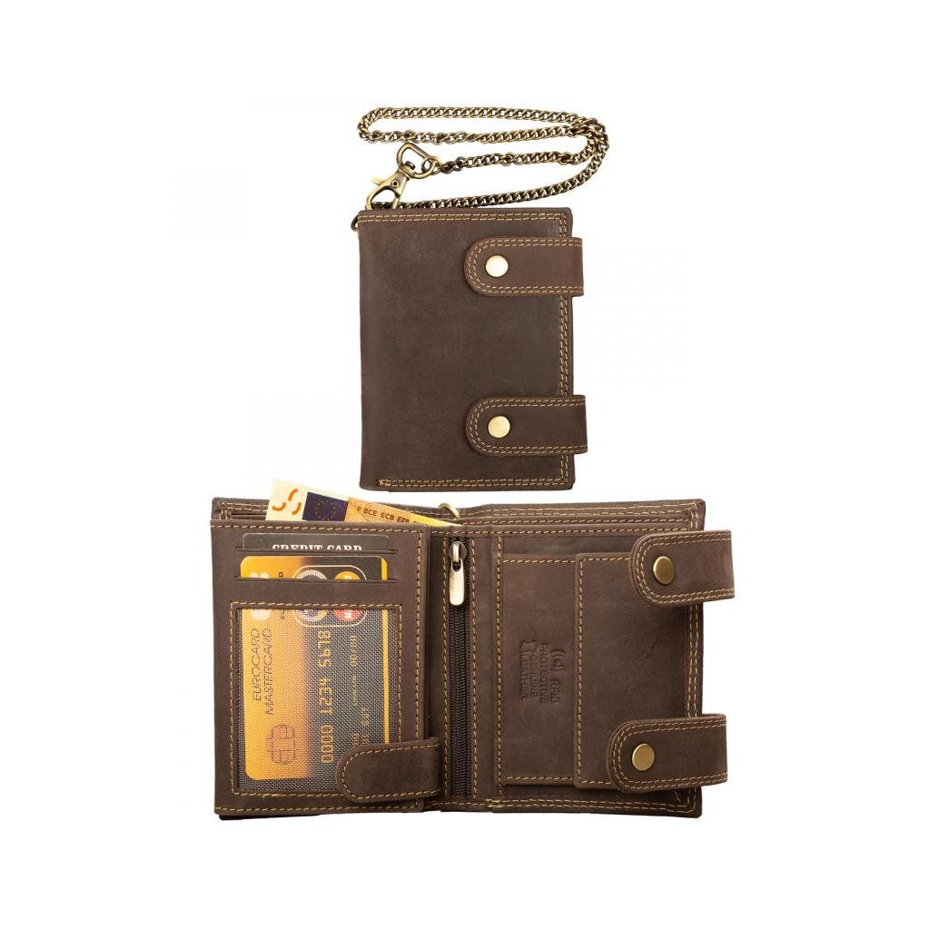 Pánská peněženka kožená s motivem zmačkané kůže se uzavírá přezkami s pevnými druky. Po otevření peněženky jsou přístupné kapsy na karty, mincovník a kapsy na bankovky. Otevřením další přezky s drukem je přístupná další část peněženky, ve které jsou průhledné kapsy na doklady a kapsy na karty. Peněženka je vyrobená z pravé kůže hnědé barvy a je značky Dariya bags. Pro pohodlné nošení využijete určitě řetěz.