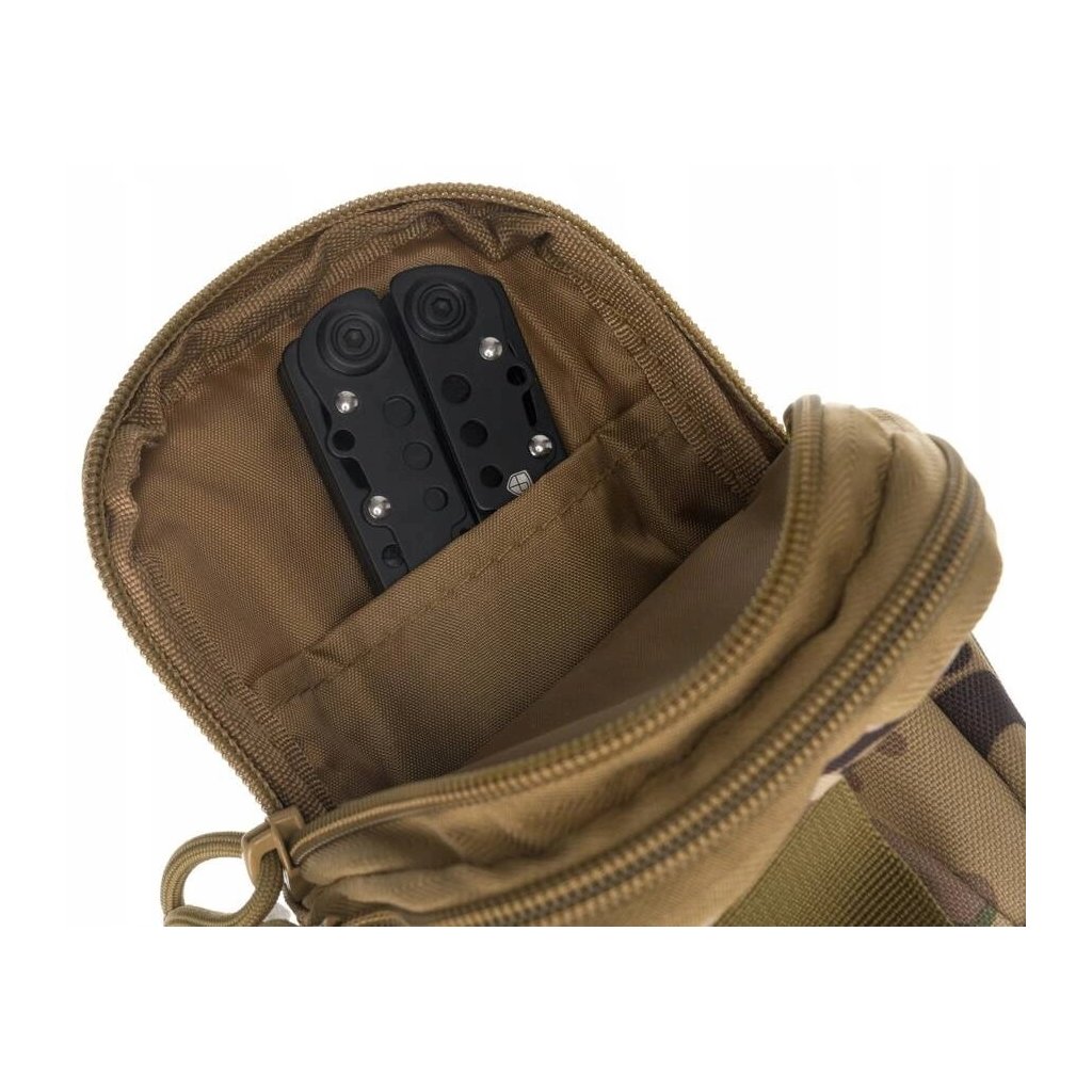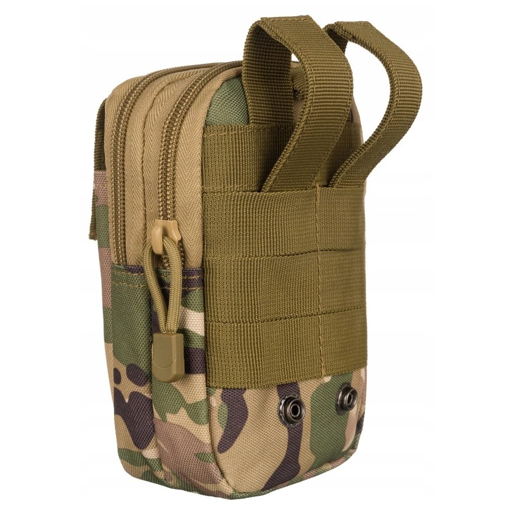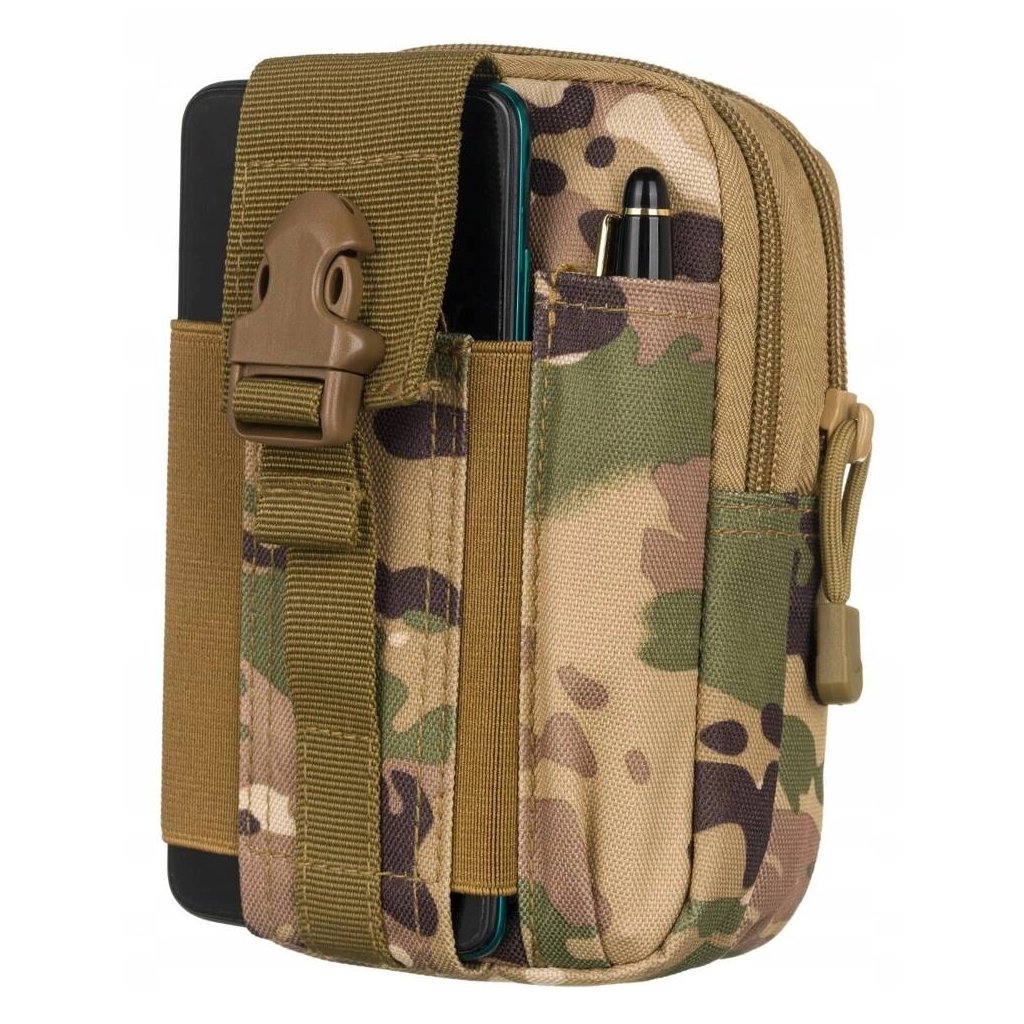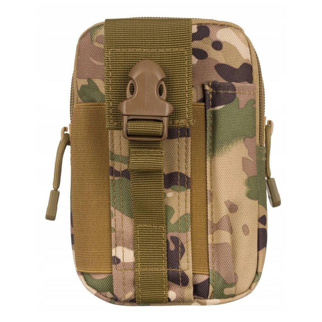 Textilní pouzdro na doklady a mobilní telefon je vyrobeno v maskáčové barvy. K zavěšení na opasek slouží poutka na zadní straně pouzdra. Pouzdro má dvě velké kapsy které se uzavírají zipem. Na přední straně pouzdra je druhá kapsa na mobilní telefon a propisku. Pouzdro je značky Inny.