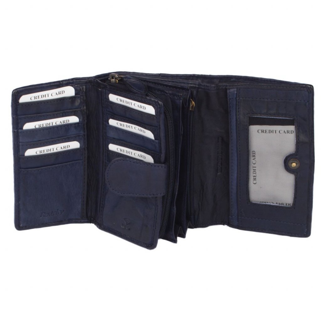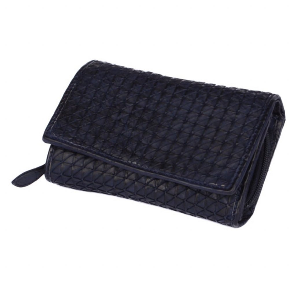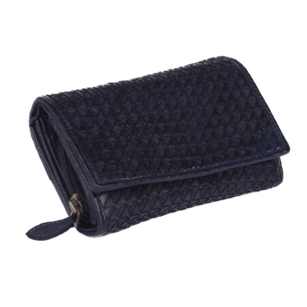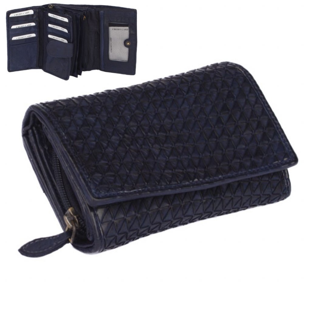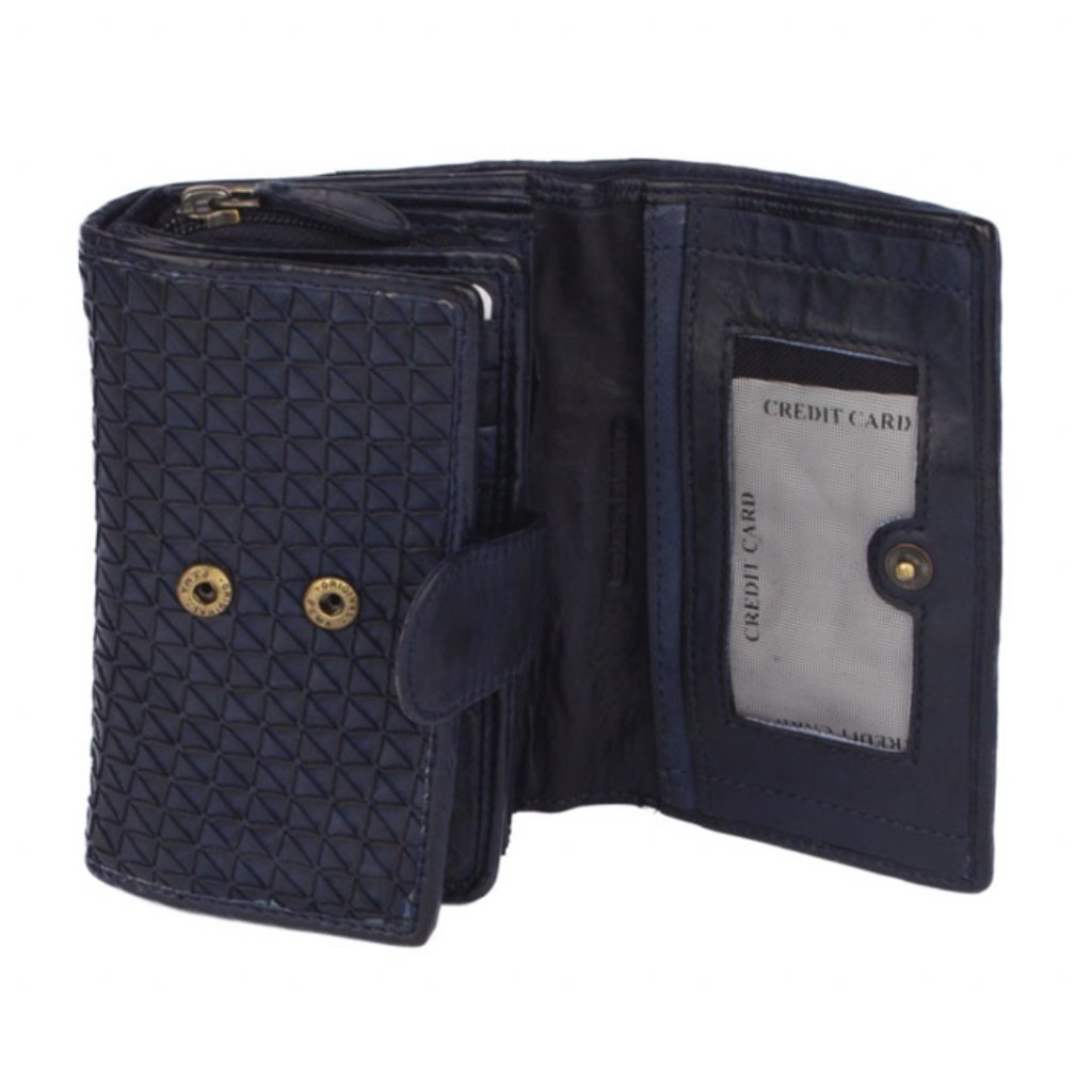 Velká dámská peněženka v nádherné tamvě modré barvě. Velká dámská peněženka je rozdělena na dvě části a zavírá se klopou s pevným drukem. Po otevření klopy jsou ihned přístupné tenké kapsy, dvě menší kapsy uvnitř peněženky a velká kapsa na bankovky v klopě i peněžence. V prostřední části peněženky je mincovník, který se uzavírá zipem s velkým jezdcem pro pohodlné otevírání. Pod vnitřní přezkou s pevným drukem jsou všechny kapsy na karty ukryty tak, aby byly v bezpečí. Peněženka je vyrobena z pravé kůže a vypadá jako by byla šitá z malých čtverečků. Peněženka je modré barvy a je zabalena v dárkové krabičce.